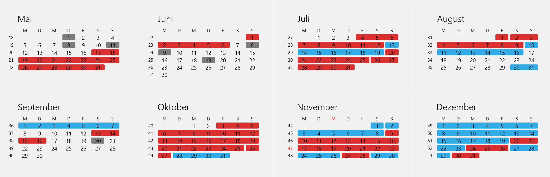 Blau und Rot: An diesen Tagen bin ich leider nicht verfügbar.